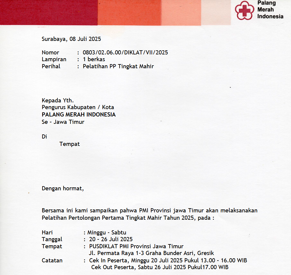 Bersama ini kami sampaikan pahwa PMI Provinsi jawa Timur akan melaksanakan Pelatihan Pertolongan Pertama Tingkat Mahir Tahun 2025, pada :