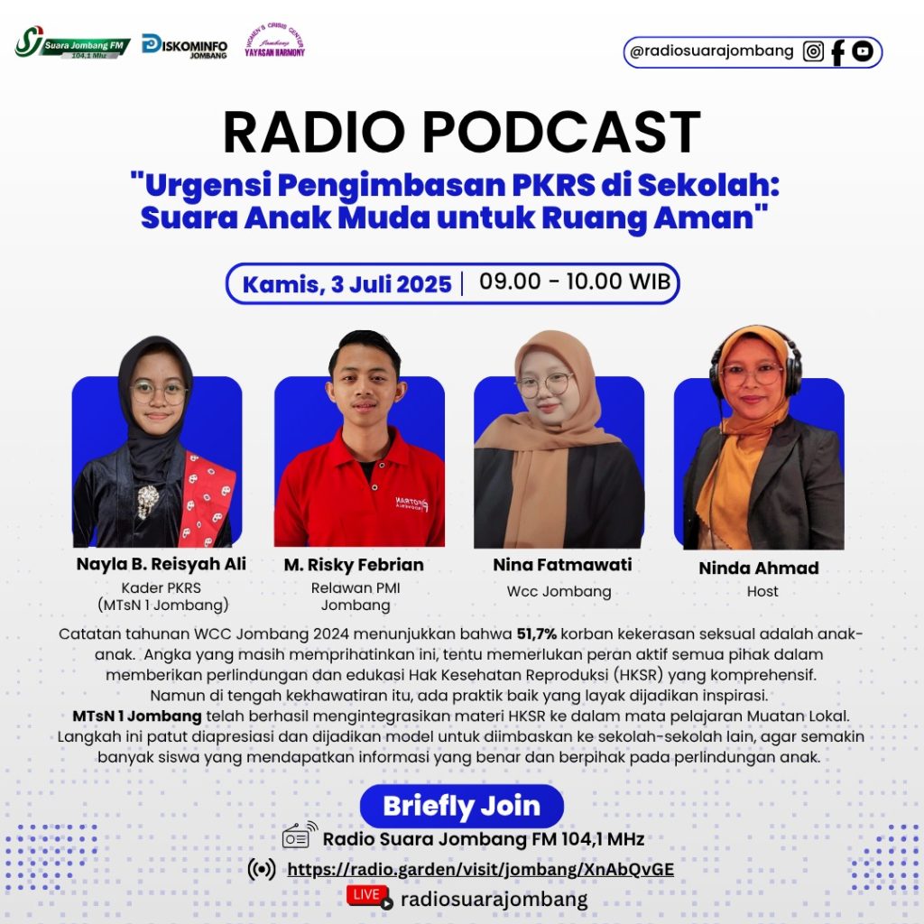 Jombang, 3 Juli 2025 – Dalam upaya memperluas jangkauan edukasi kesehatan reproduksi dan seksual yang ramah anak, Palang Merah Indonesia (PMI) Kabupaten Jombang bersama Women’s Crisis Center (WCC) Jombang dan MTsN 1 Jombang, hadir dalam program Podcast Edukatif Radio Suara Jombang bertajuk “Urgensi Pengimbasan PKRS di Sekolah: Suara Anak Muda untuk Ruang Aman”.