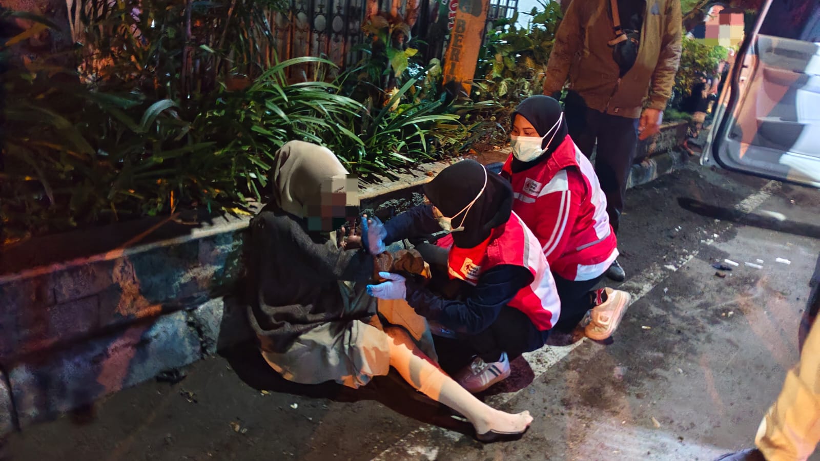 Dari pemeriksaan fisik, ditemukan luka robek pada tungkai kanan bagian bawah (cruris inferior dextra) sepanjang kurang lebih 10 cm serta perdarahan pada bagian kepala sisi kanan (os temporalis dextra). Tim PMI segera melakukan perawatan luka dengan balut tekan hingga perdarahan dapat dikendalikan, serta melakukan observasi terhadap kondisi cedera korban sebelum dirujuk ke RSUD Jombang. Selama proses evakuasi, korban juga mendapatkan dukungan psikologis awal (Psychological First Aid/PFA).