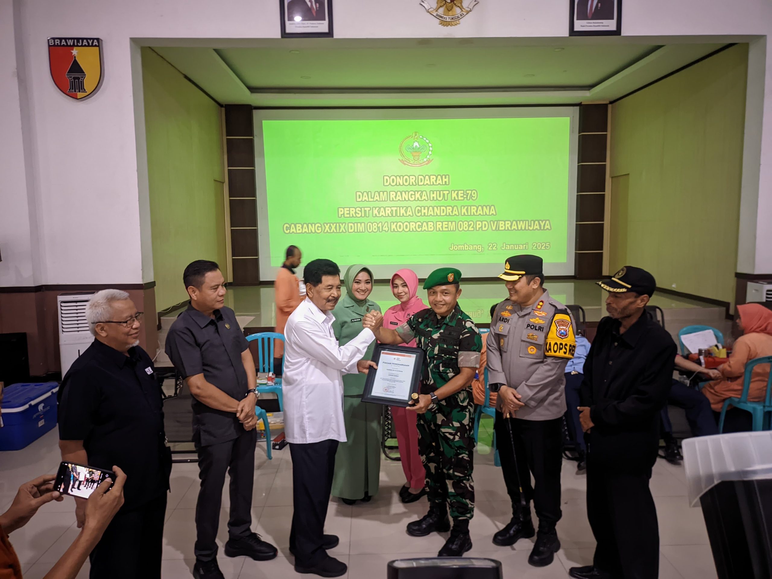 Jombang, 22 Januari 2025 – Palang Merah Indonesia (PMI) Kabupaten Jombang memberikan penghargaan kepada Dandim 0814/Jombang atas perannya dalam terselenggaranya kegiatan donor darah pada peringatan Hari Ulang Tahun Persit Kartika Chandra Kirana (KCK) ke-79. Penghargaan ini diserahkan sebagai bentuk apresiasi atas dedikasi Kodim 0814/Jombang dalam mendukung aksi kemanusiaan yang memberikan manfaat nyata bagi masyarakat.