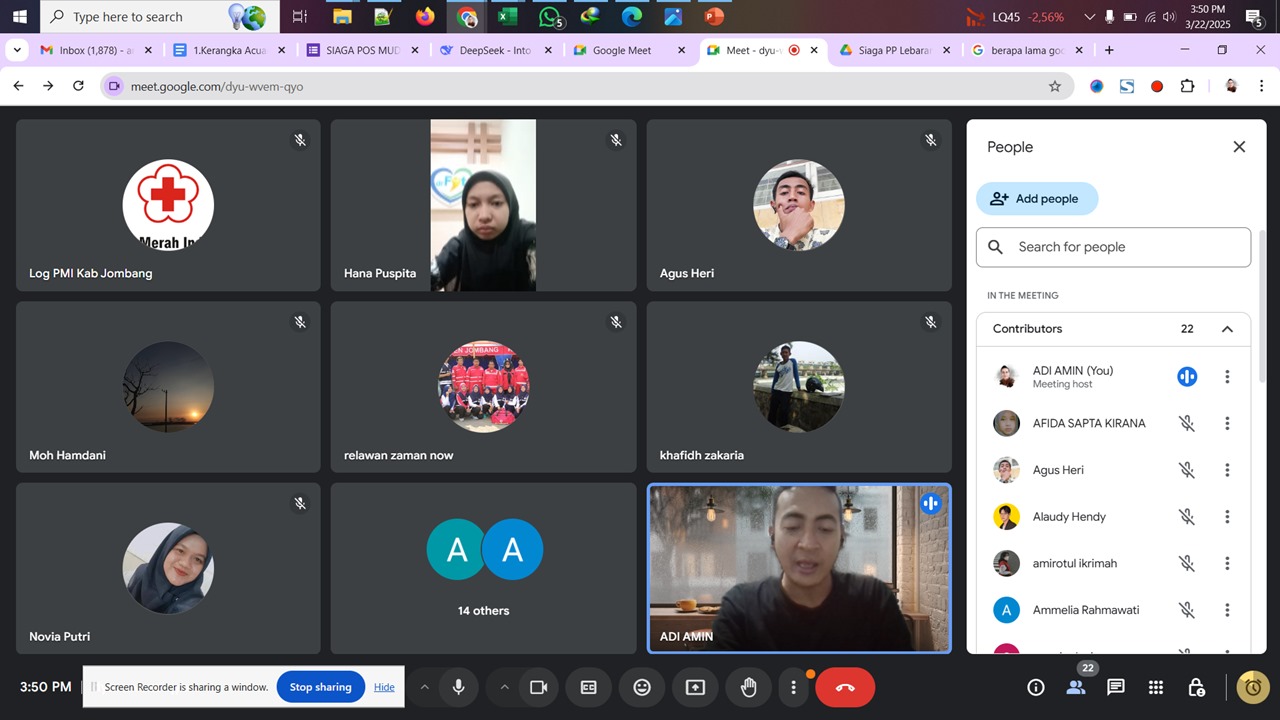 Jombang, 22 Maret 2025 – Menyambut masa mudik Lebaran 2025, Palang Merah Indonesia (PMI) Kabupaten Jombang mengadakan Briefing dan Koordinasi persiapan Siaga Pos Mudik Lebaran 2025. Kegiatan ini dilaksanakan secara daring pada Sabtu, 22 Maret 2025, pukul 15.30 WIB, dan diikuti oleh seluruh tim relawan yang akan bertugas.