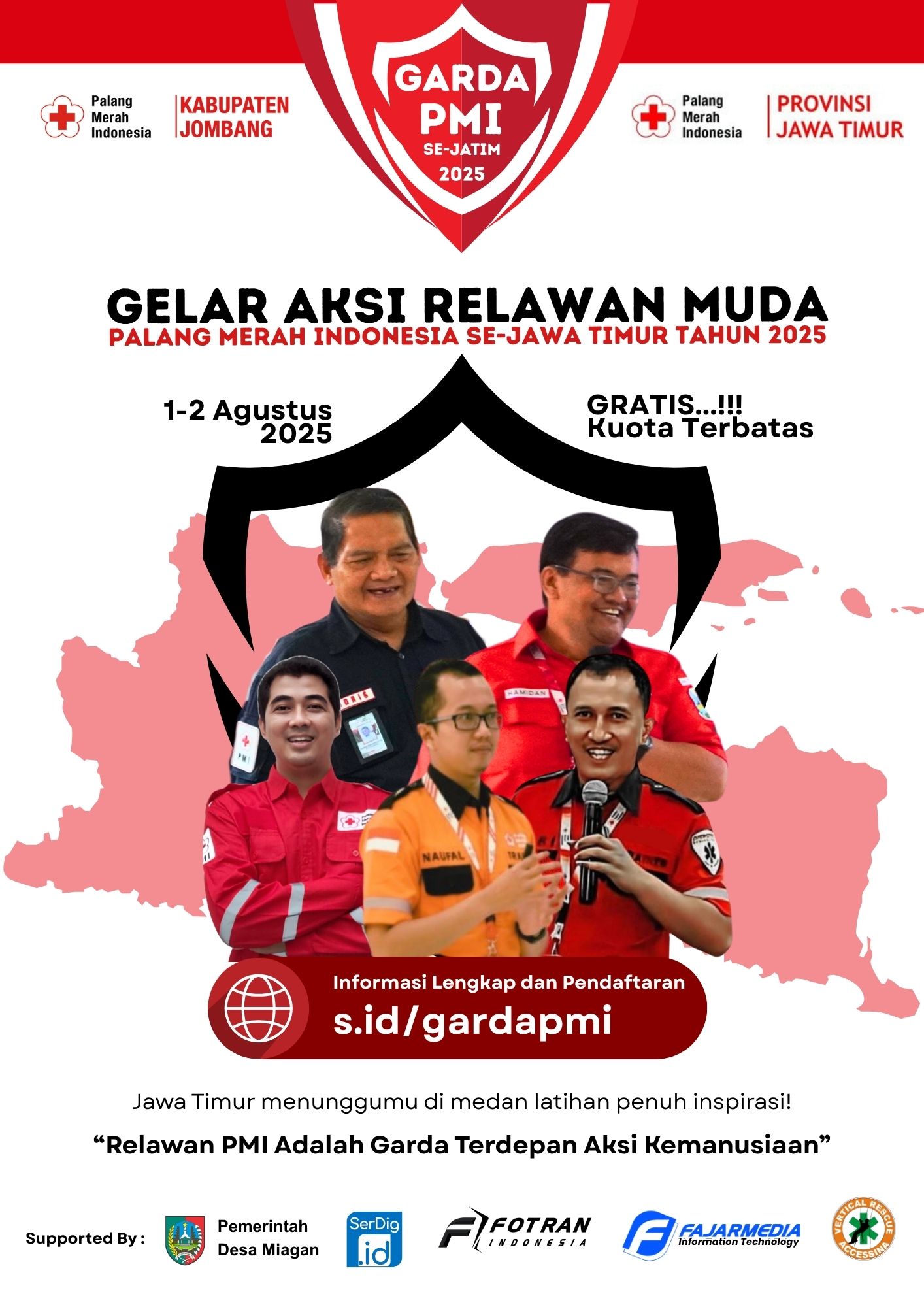 Diselenggarakan atas inisiasi Bidang Pendidikan dan Pelatihan, Informasi dan Komunikasi PMI Kabupaten Jombang, kegiatan ini akan berlangsung selama dua hari penuh, pada tanggal 1–2 Agustus 2025, bertempat di Alun-alun Cemara, Desa Miagan, Kecamatan Mojoagung, Kabupaten Jombang. Pendaftaran peserta telah dibuka sejak 1 Juli dan akan ditutup pada 26 Juli 2025 melalui laman resmi: s.id/gardapmi.