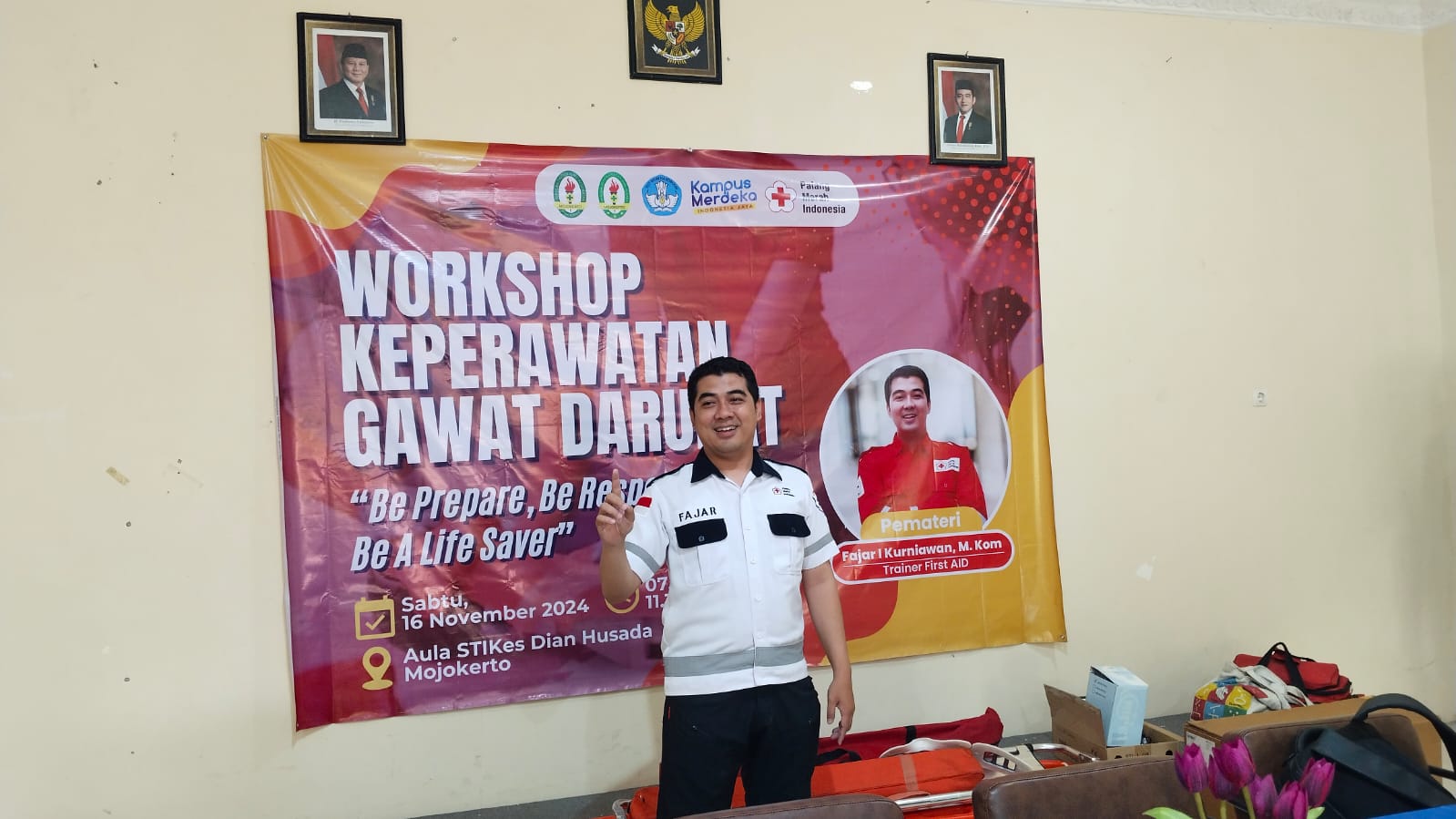 Mojokerto, 16 November 2024 – Program Studi S1 Ilmu Keperawatan STIKES Dian Husada Mojokerto menggelar Workshop Keperawatan Gawat Darurat bertema “Be Prepare, Be Responsive, and Be A Live Saver.” Kegiatan ini menghadirkan Fajar Indra Kurniawan, M.Kom, seorang First Aid Trainer dari PMI Kabupaten Jombang, sebagai narasumber utama. Workshop diikuti oleh sekitar 50 mahasiswa semester akhir yang antusias menyimak materi dan simulasi penanganan gawat darurat.