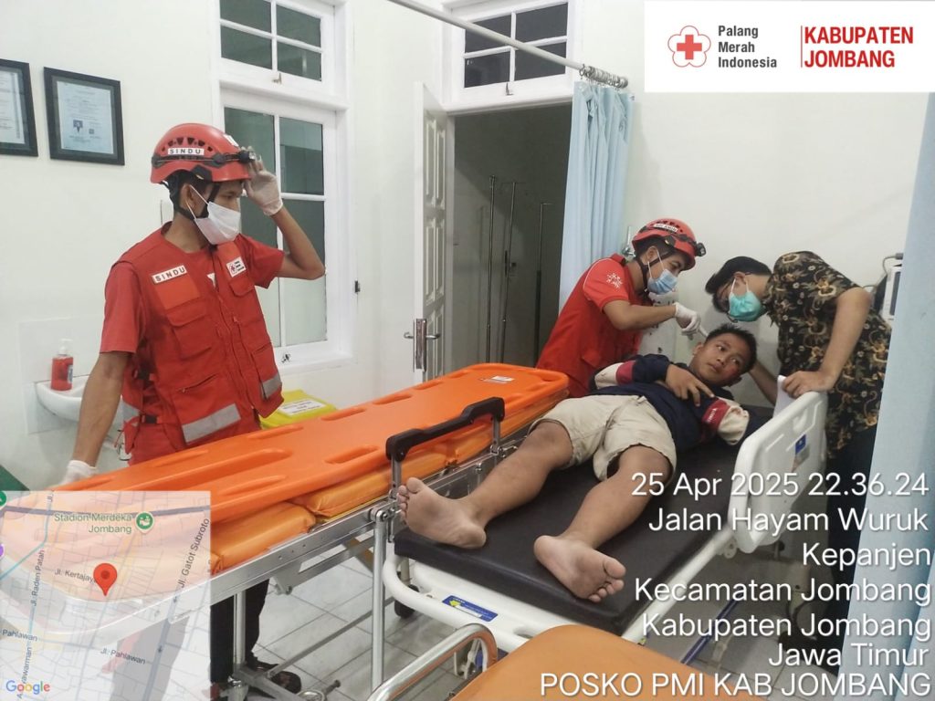 Jombang, 25 April 2025 – Palang Merah Indonesia (PMI) Kabupaten Jombang kembali menunjukkan respon cepat dalam memberikan layanan kemanusiaan. Kali ini sekitar Pukul 22.29 WIB, tim PMI Sindu Wahmuko dan Adi Amin diterjunkan ke lokasi kecelakaan lalu lintas yang terjadi di Jalan Hayam Wuruk, tepatnya di selatan Stadion Merdeka Jombang, pada Jumat Malam dan dibawa menuju RSU dr. Moedjito .