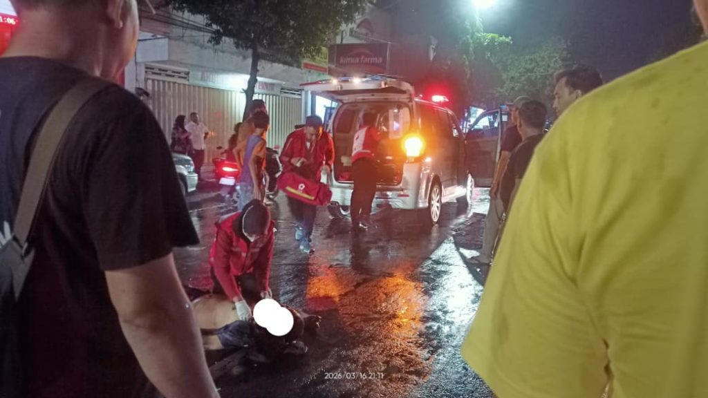Relawan Palang Merah Indonesia Kabupaten Jombang memberikan respon cepat terhadap kejadian kecelakaan lalu lintas yang melibatkan kendaraan roda dua dan roda empat di wilayah Jalan Gus Dur, tepatnya di depan Topsel Jombang, Desa Candimulyo, Kecamatan Jombang, Kabupaten Jombang pada Senin, 16 Maret 2026. Informasi kejadian diterima dari relawan Korps Sukarela PMI yang berada di sekitar lokasi kejadian.
