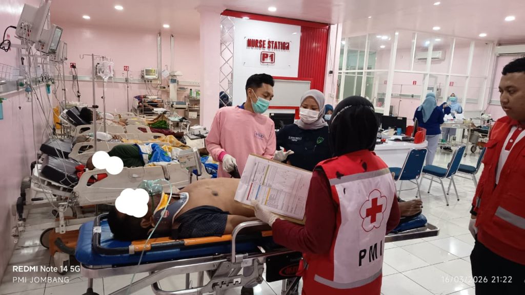 Dalam penanganan kejadian ini, PMI Kabupaten Jombang menurunkan satu unit ambulans dengan tiga personel yang terdiri dari satu driver dan dua petugas medis. Seluruh proses penanganan dilakukan sesuai dengan prosedur pertolongan pertama pada kasus trauma kecelakaan lalu lintas guna memberikan penanganan cepat dan aman bagi korban.
