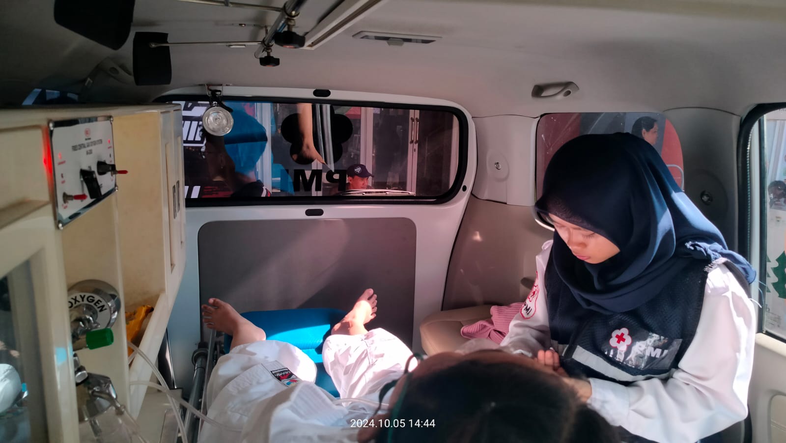 Tim PMI yang terdiri dari tiga petugas yaitu Waqit Farisman, Afida Sapta Kirana, dan Virda Adimia Virnanda hadir di lokasi untuk memberikan layanan kesehatan menggunakan satu unit ambulance. Petugas terlihat sigap melakukan pemeriksaan kesehatan pada para atlet, yang menunjukkan kesiapsiagaan PMI dalam memberikan pertolongan pertama, baik sebelum maupun setelah pertandingan.