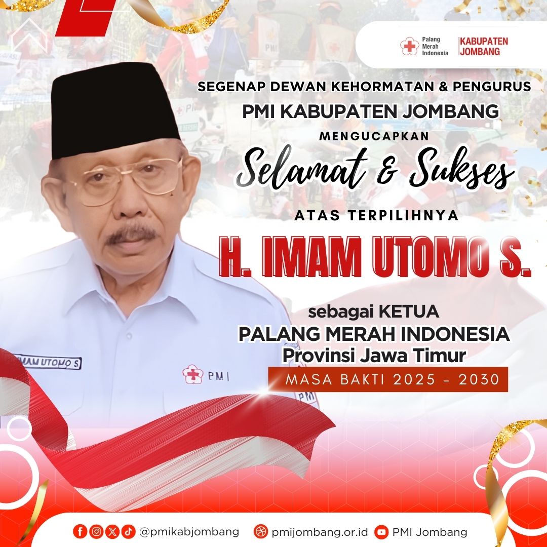 Palang Merah Indonesia (PMI) Kabupaten Jombang menyampaikan selamat dan sukses atas terpilihnya H. Imam Utomo S. sebagai Ketua Palang Merah Indonesia Provinsi Jawa Timur masa bakti 2025–2030. Pengukuhan tersebut berlangsung pada Musyawarah Provinsi (Musprov) PMI Jawa Timur yang diselenggarakan di Hotel Santika, Jalan Raya Gubeng Surabaya, dan dihadiri oleh 38 PMI Kabupaten/Kota se-Jawa Timur.