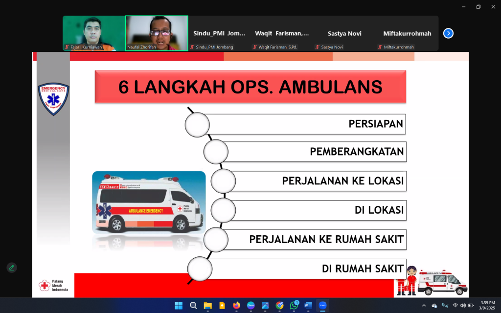 Dalam webinar ini, para peserta diberikan materi yang komprehensif terkait operasional ambulans PMI, antara lain: